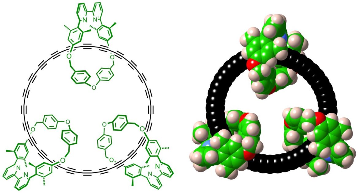 In the new study, the molecule cyclo[48]carbon was synthesized as a catenane, i.e. with the C48 ring threaded through three other macrocycles. These threaded macrocycles increase the stability of C48 by preventing access to the protected cyclocarbon.