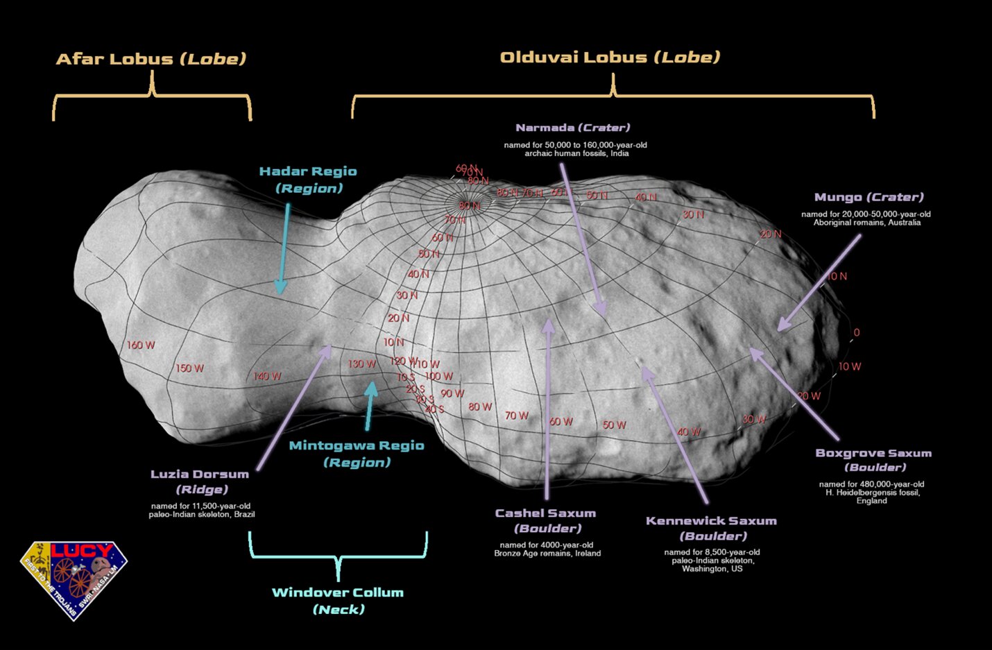 The asteroid’s smaller lobe is called the Afar lobe after the Ethiopian region where Lucy and other human ancestor fossils were found. The large lobe is named the Olduvai lobe after a Tanzanian river gorge. The neck connecting the two lobes was named after the Windover Archeological Site near Cape Canaveral, Florida, where Lucy was launched in 2021. This is the first time the IAU has recognized an asteroid’s neck as an officially named feature. Additional features include two smooth areas on the neck named the Hadar region, after the site of the Lucy fossil’s discovery, and the Minatogawa region, where the oldest known hominins in Japan were found.