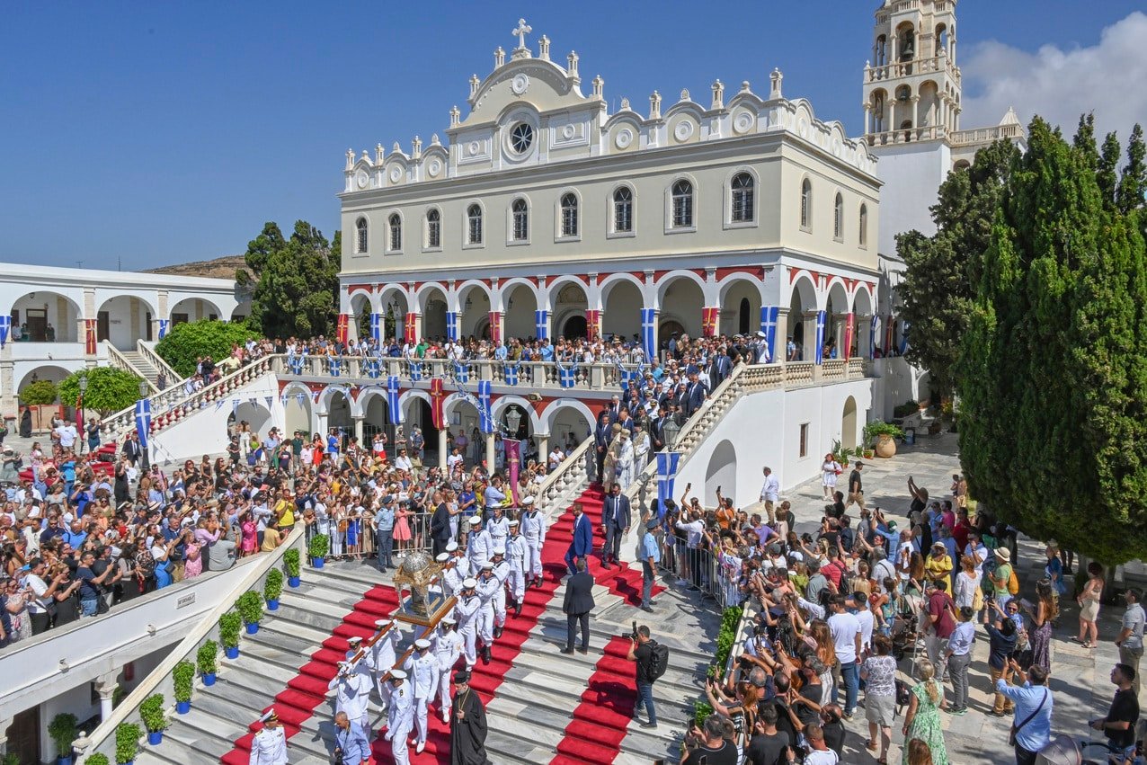 By royal decree in 1836, the celebration of the Panagia on Tinos was established as an eight-day observance, culminating on August 23, known as the “Nine Days of the Theotokos.” Throughout the festival, hymns and laments are chanted before the epitaph and the icon, filling the island with a deeply moving spiritual atmosphere that resonates with pilgrims and visitors alike.