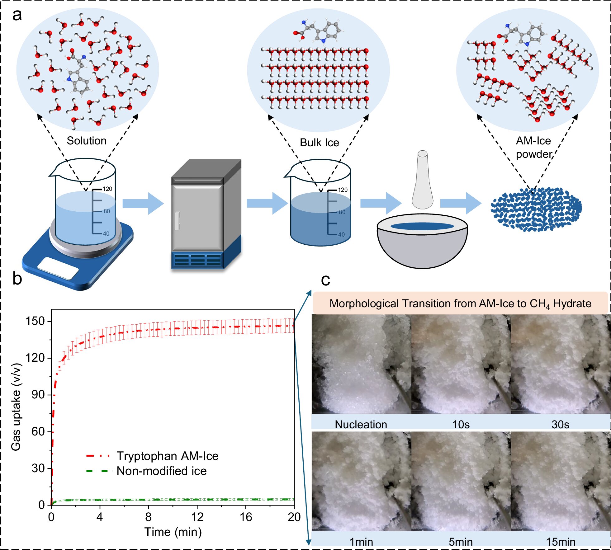 In a new study, “Rapid conversion of amino acid modified-ice to methane hydrate for sustainable energy storage,” published in Nature Communications, the researchers showed that freezing water with a small amount of these naturally occurring compounds produces an “amino-acid-modified ice” that locks in methane gas in minutes. In tests, the material reached 90% of its storage capacity in just over two minutes, compared with hours for conventional systems.