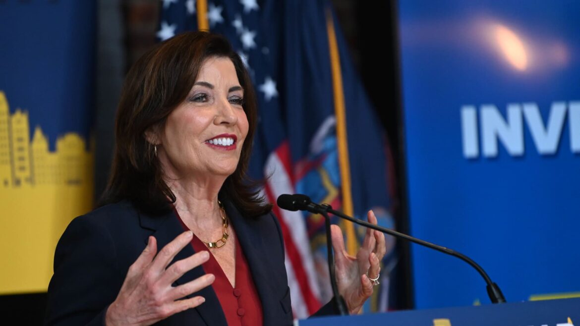 ALBANY, NY – MAY 21: Gov. Kathy Hochul holds a press conference at Common Roots Outpost to announce MIG, a national consultant group, will guide public engagement process for spending $200 million in downtown Albany on Wednesday, May 21, 2025, in Albany, N.Y. (Lori Van Buren/Albany Times Union via Getty Images)