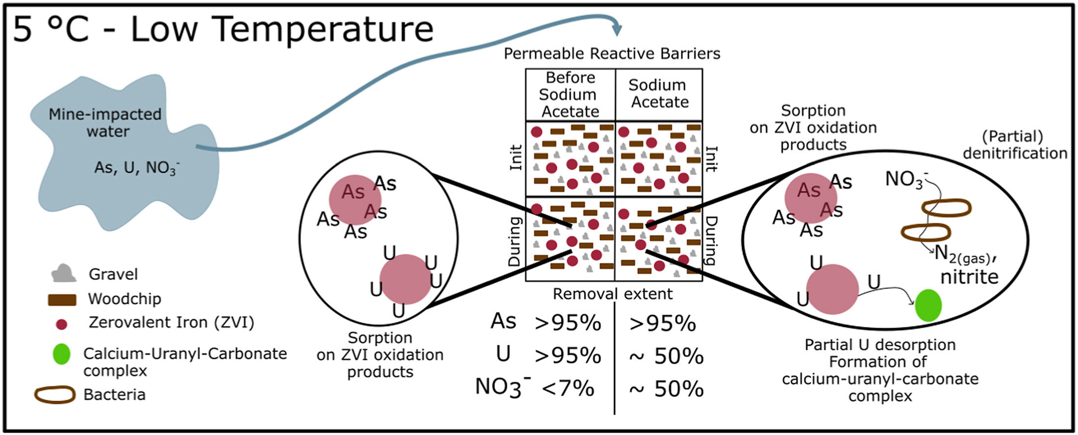 The researchers found the PRB did a good job trapping the arsenic and uranium, but was less effective in removing the nitrate, because of the colder temperature. When they added sodium acetate to the filter, it caused good bacteria to grow and clean the nitrate from the water. But that change resulted in the barrier not trapping as much uranium.