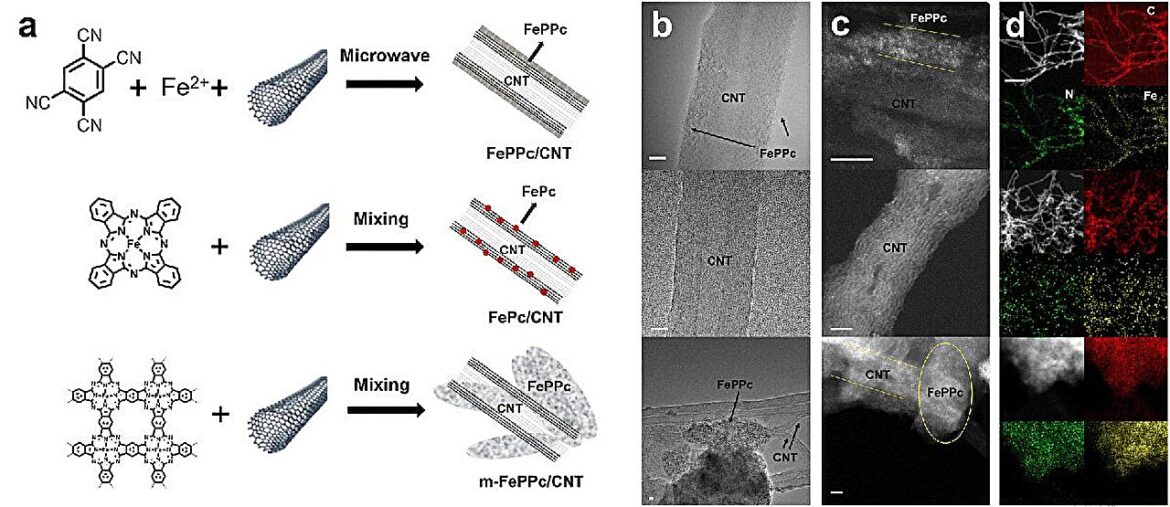 The new catalyst was made by forming a thin layer of iron polyphthalocyanine (FePPc) around carbon nanotubes. This method allowed more iron to be incorporated into the material than in earlier approaches, while still keeping the same type of active sites that drive the reaction.
